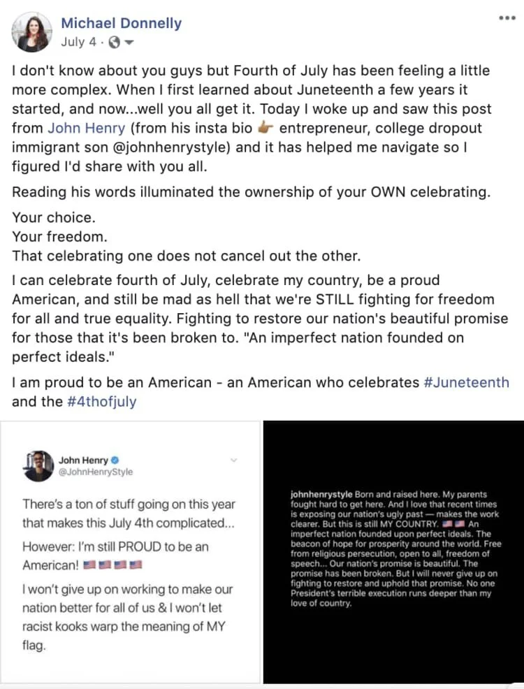 This year as the 4th of July approached, I had been feeling a lot of frustration, anxiety, guilt (white guilt), and I saw a post by an entrepreneur I admire and follow, John Henry, and felt a bit…relieved.